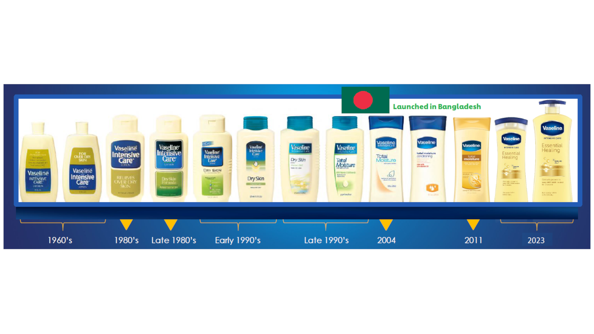 Vaseline has been present in Bangladesh since the 1960s. Lever Bangladesh introduced Vaseline lotions and jelly in the late 90s. Since then, the brand has been spearheading the market development of the lotions and jelly via traditional marketing tools.